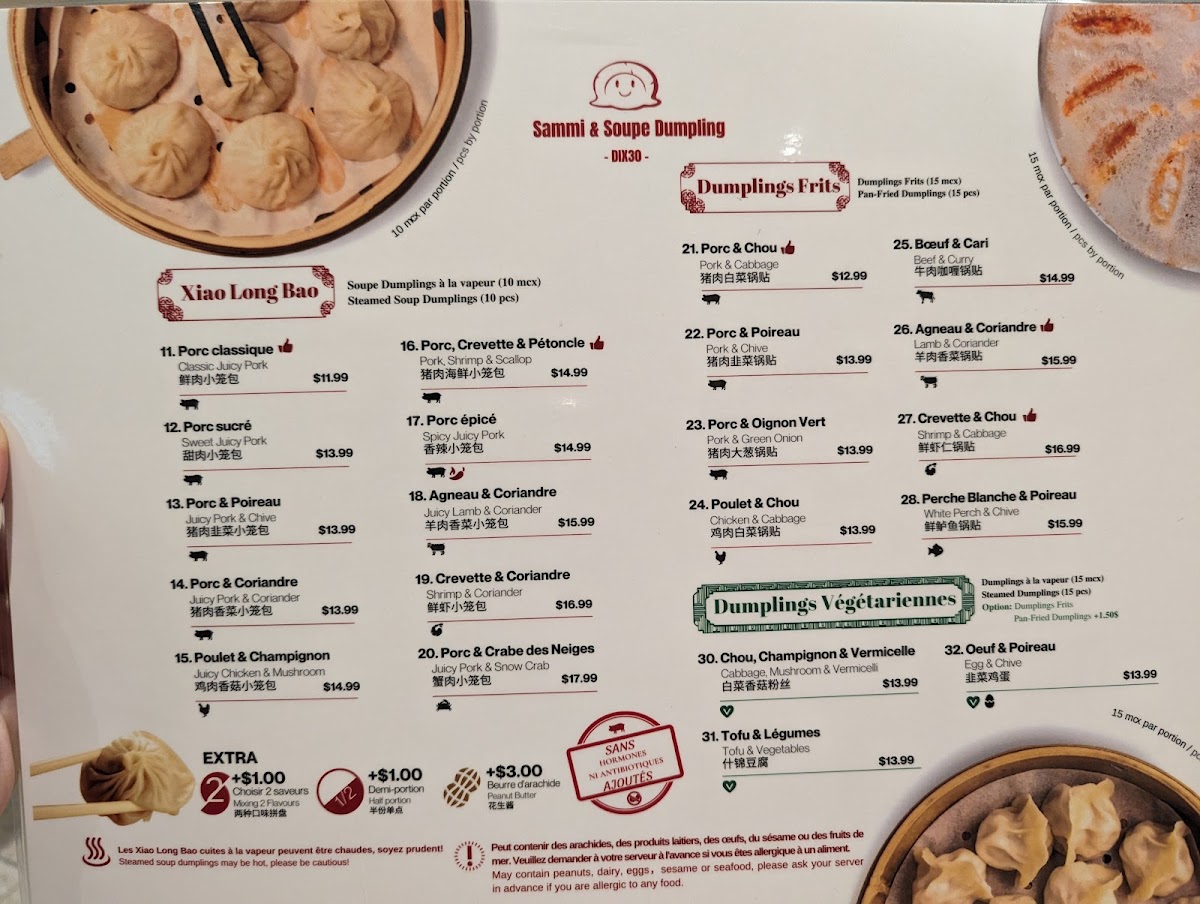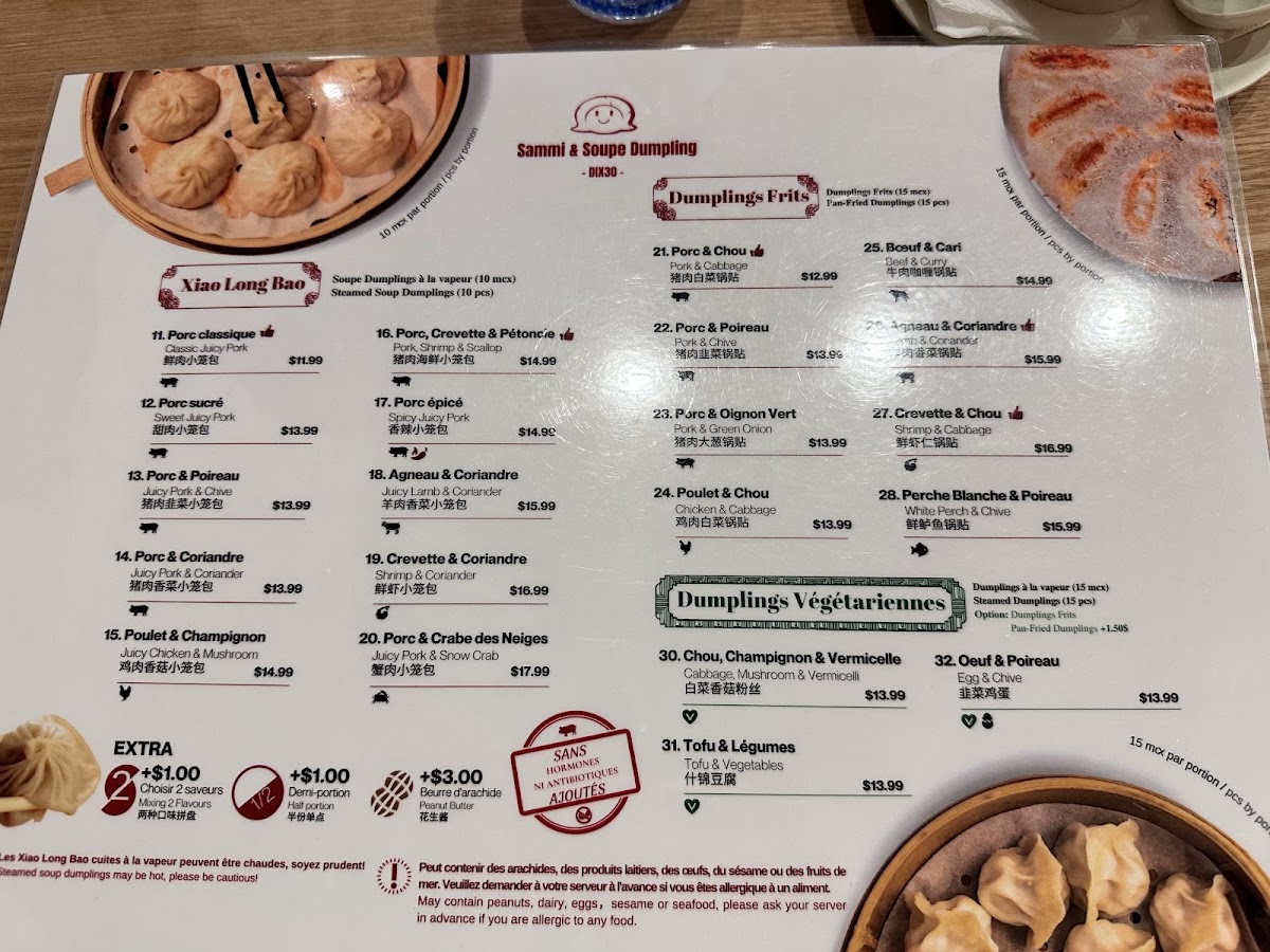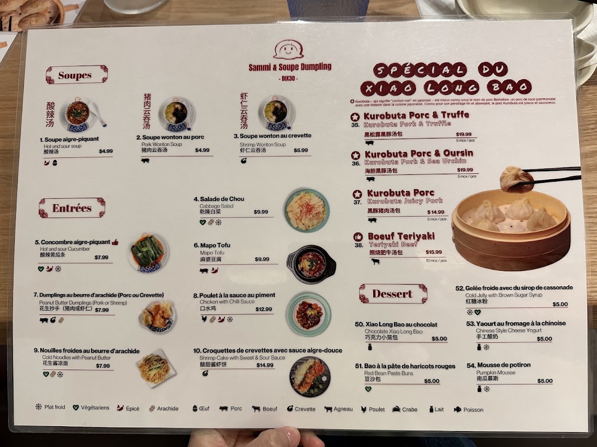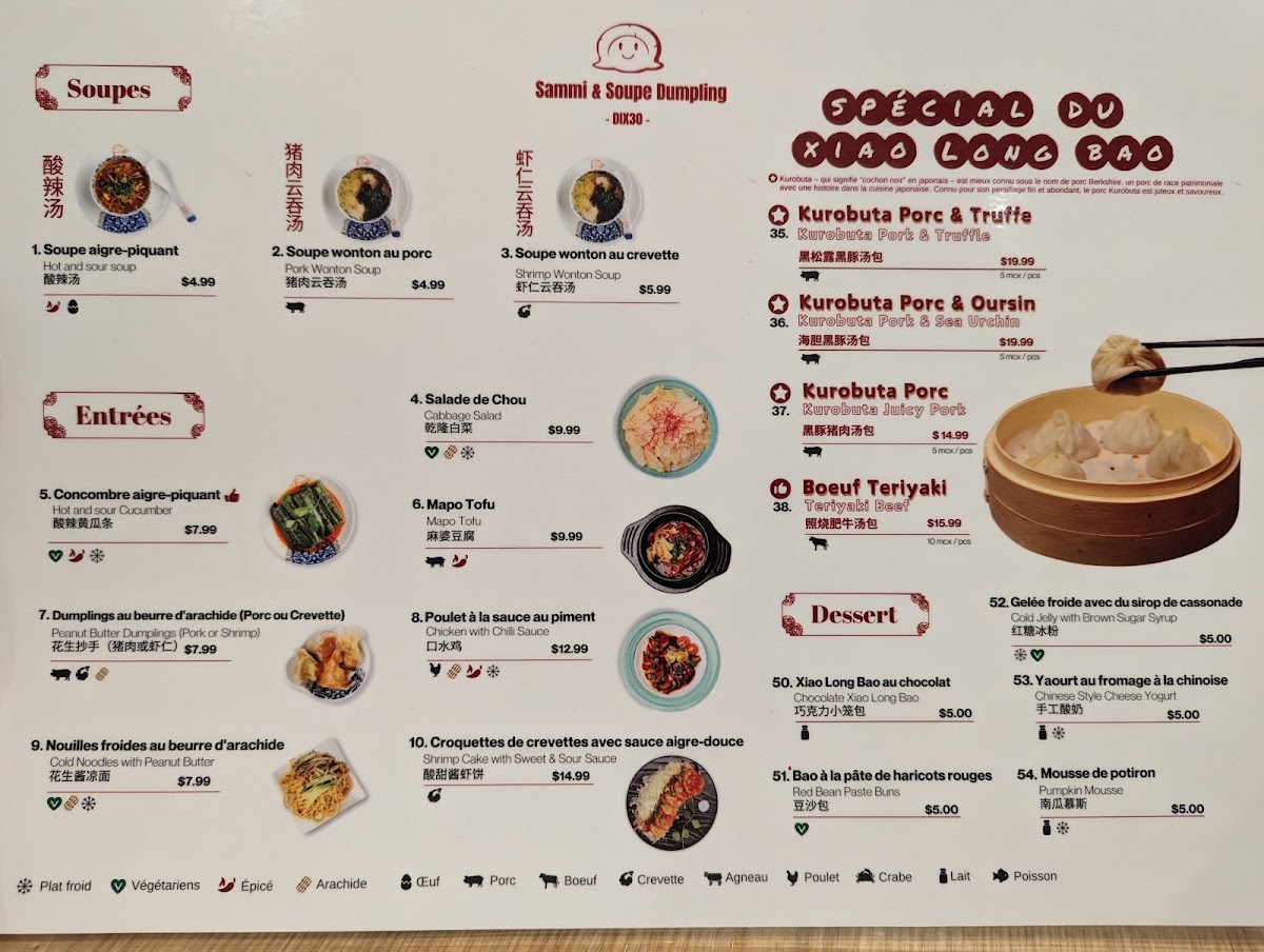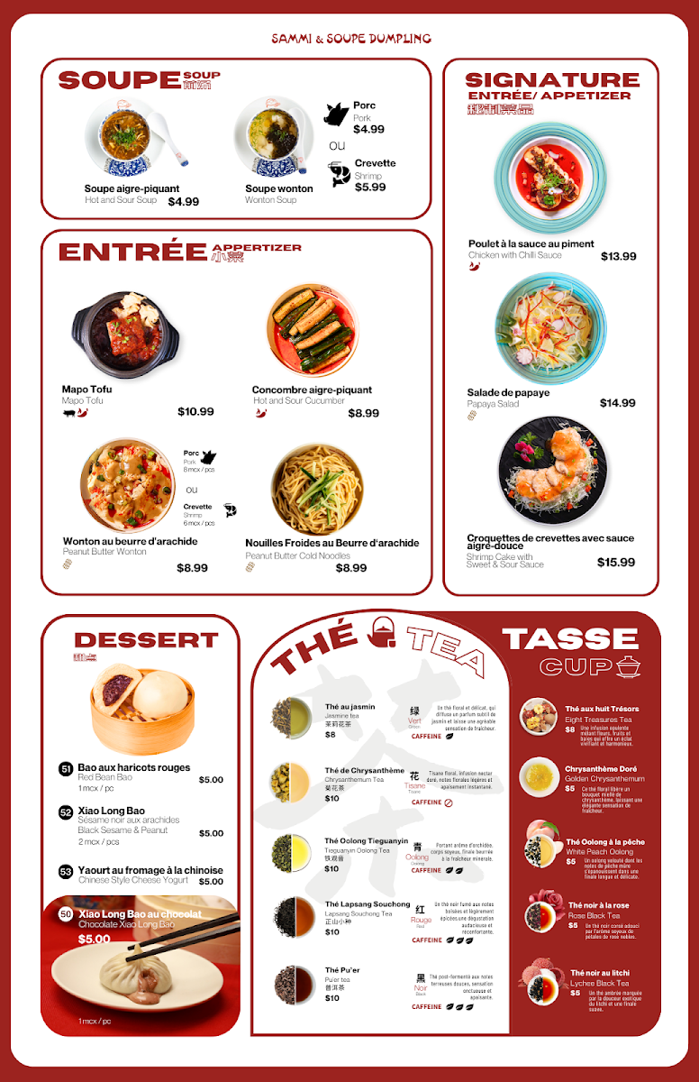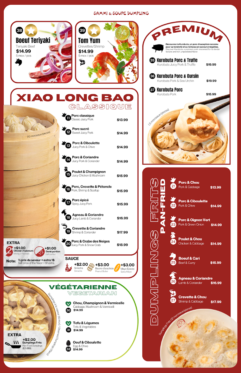 From a reviewer’s perspective, the menu at Sammi & Soupe Dumpling offers a focused yet satisfying selection centered on dumplings and comforting Chinese dishes. The soup section features classics like Hot & Sour Soup, Pork Wonton Soup, and Shrimp Wonton Soup, while appetizers such as Hot And Sour Cucumber, Peanut Butter Dumplings (Shrimp/Pork), Cold Noodles With Peanut Butter, Cabbage Salad, and Mapo Tofu provide a flavorful start. The highlight is clearly the soup dumplings, especially Classic Juicy Pork, Sweet Juicy Pork, Juicy Pork & Chive, Juicy Pork & Coriander, and Juicy Chicken & Mushroom, along with premium options like Kurobuta Pork & Truffle, Kurobuta Pork & Sea Urchin, Kurobuta Juicy Pork, and Teriyaki Beef. Pan-fried choices such as Pork & Cabbage, Pork & Chive, Pork & Green Onion, Chicken & Cabbage, and Beef & Curry, plus vegetarian options like Cabbage, Mushroom & Vermicelli, Tofu & Vegetables, and Egg & Chive, make the menu accessible to different tastes. Desserts including Chinese Style Cheese Yogurt, Red Bean Paste Buns (2pcs), Chocolate Xiao Long Bao, and Cold Jelly with Brown Sugar Syrup round out the experience, and frozen options like Chicken & Mushroom, Beef Curry, Tofu & Vegetables, Pork & Cabbage, and Pork & Chive are available to take home, making the menu both diverse and dumpling-focused for a satisfying dining experience.